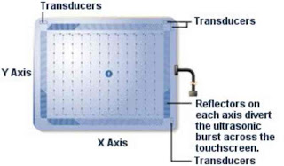 The SURFACE WAVE ACOUSTIC SYSTEM works with help of wave energy. This enables a touch to transform into another form of energy and deliver the command which in response perform the desired action. A Pair of transducers is placed on glass plate sides. In the Glass Plates there are reflectors. On touching the screen wave produced and which transforms into energy for fulfilling the command. It tells where on the screen touch is detected.