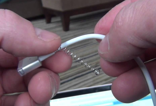 This is that hack we mentioned earlier for preventing your Apple charging cables and other cords from fraying: Grab the spring out of a ballpoint pen, then stretch it and wrap it around the part of the cord that tends to bend, and it'll keep it straight forever, thus stopping it from wearing down over years.