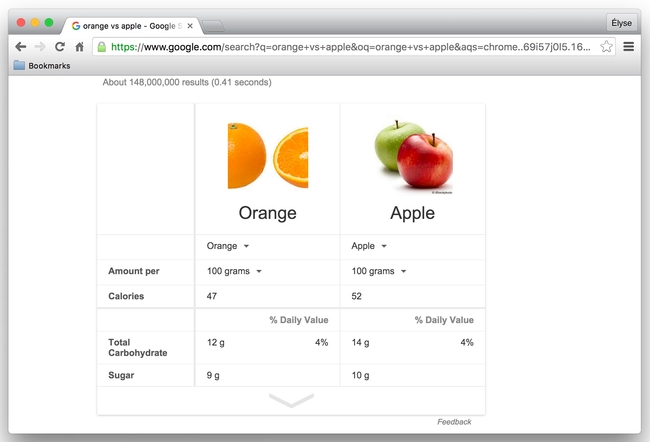 The health freaks out there will certainly love this trick: Google search “[food] vs [food]” to compare nutritional values between any two foods. We tried it with orange vs apple, for instance, and got this.